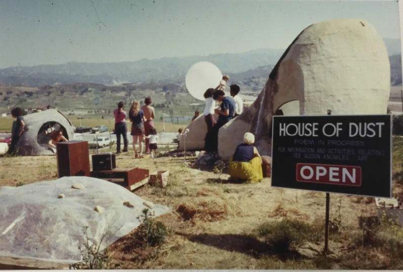 Inicialmente The House of Dust fue instalada en la sede de CalArts en Burbank donde en 1971 la mayor de las estructuras es destruida por un terremoto. Ese mismo año, cuando la sede de CalArts se traslada Valencia (California) The House of Dust vuelve a instalarse allí (Moss y Fabio, 2022 p. 138).↩︎