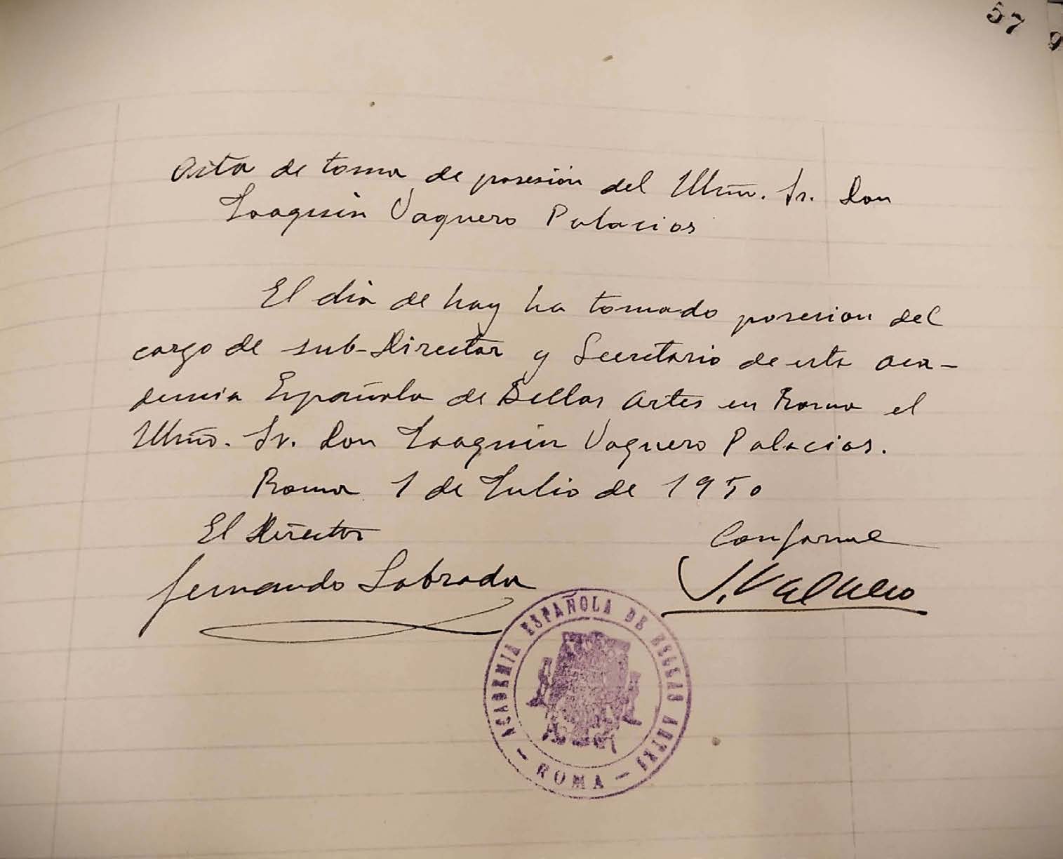 Se procedió entonces el 26 de enero de 1950 al nombramiento de Joaquín Vaquero Palacios como Subdirector de la Academia “en atención a las circunstancias personales” que en él concurrían, y se le encomendaban especialmente las funciones de la Secretaría (Comunicado a Joaquín Vaquero, 1950, 26 de enero, s.p.). No obstante, Vaquero no tomó posesión del cargo hasta el 1 de julio de 1950 (Acta de Toma de Posesión, 1950) (fig. 1). Se entendió entonces el nombramiento de Vaquero como un refuerzo de la presencia española en Italia, “incorporándose una personalidad tan destacada y que indudablemente tendrá en plazo breve una presencia activa en los medios artísticos, intelectuales y sociales de Roma” (Nota para el Ministro de Educación Nacional, 1950, 26 de enero, s.p.). Se adelantaba, así, una pincelada de lo que luego quedaría abiertamente puesto de manifiesto: la inclusión de Vaquero en todo un movimiento diplomático en el que entablar relaciones culturales con el resto de los países e integrar la vida de la Academia en la vida artística de la ciudad eterna.