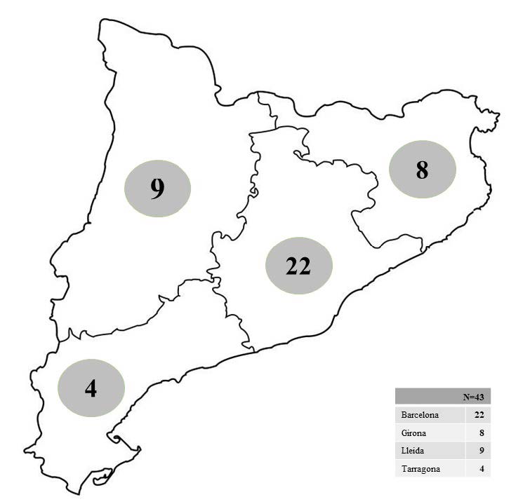 El método de selección de la muestra para este estudio fue un muestreo no probabilístico de tipo intencional (Babbie, 2000). Para ello se contó con la participación de los museos reconocidos por la Generalitat de Catalunya que se encontraran operativos y con alguna red social activa (Facebook, Instagram o x) para el período de la pandemia, sumando una participación total de 43 museos. Respecto al total de los equipamientos de la comunidad autónoma que se ajustaban a los criterios previamente establecidos, la muestra representa el 39,8%. En la figura a continuación se presentan los museos participantes de la encuesta según su provincia.