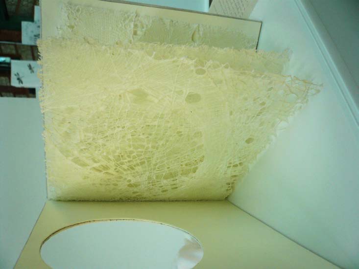 El entramado delicado de las páginas, realizado manualmente con algodones, crea con sutiliza una red consistente. Como su labor de cuidado la creación es una tarea atenta y sanadora, una atribución propia de un rol maternal. Remienda las telas usadas meticulosamente, creando un entramado abierto que deja ver la sucesión de muselinas, superpuestas una sobre otra, como las atenciones continuadas. Visual y táctilmente conecta con la cestería, los telares, los encajes y los hilos. En su trabajo artístico, Stella Redruello recurrirá nuevamente a las fibras tejidas como base de creación de libros de artista para hablar de la emoción desde la intimidad. En sus obras Vivencias I (2022) o Vacíos (2023), además incorpora grabados, papeles artesanales y realiza encuadernaciones manuales con hilo y tarlatán.