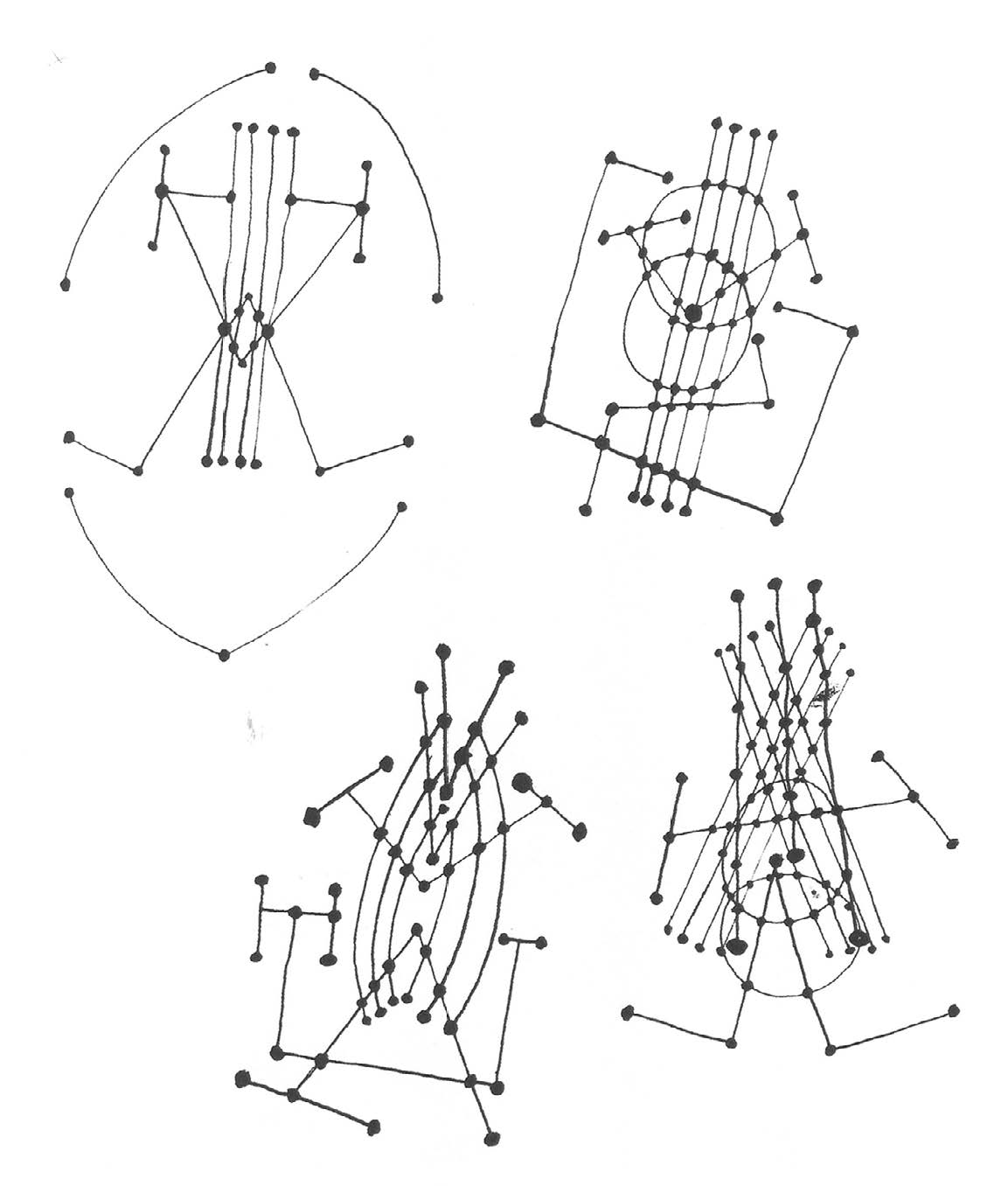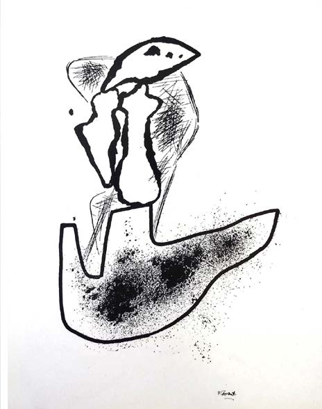 Así pues, los juguetes de 1935 tienen un carácter germinal y su minucioso proceso de diseño actúa como banco de pruebas de muchas de las ideas que vertebran la obra ferrantiana. El dibujo se convierte, en consecuencia, en una forma de expresión fundamental para reflexionar sobre este asunto, y posee una importancia creciente en su trabajo a partir de los años 30, reuniendo las principales preocupaciones teóricas asociadas con el dinamismo en el arte. Además, la composición a partir de piezas independientes que se combinan en un conjunto tiene un amplio recorrido en su escultura: la observamos en sus Objetos hallados de 1945, creados con elementos encontrados en la playa, en su Serie ciclópea de 1947 y en algunas piezas de pequeño formato de los 50. Desde el punto de vista gráfico, destaca la serie de Figuras del mar, dieciséis dibujos a tinta reunidos en un libro prologado por Mathias Goeritz y publicado por la Galería Clan en 1948. En ellos se vuelve a reflejar el lento pero inexorable movimiento de la naturaleza, cuyas fuerzas orgánicas de crecimiento y adaptación actúan bajo la presión de los elementos ambientales, energías constrictoras y desgastantes que modelan la materia física. Así, las piezas, o fragmentos aparentemente creados por el azar, se concatenan, se combinan, se apoyan unas en otras produciendo frágiles o sólidos equilibrios, por lo que se sugiere una posibilidad de cambio, al menos a través de la opción de imaginar, lúdicamente, otras posibles organizaciones (Figs. 2 y 3).