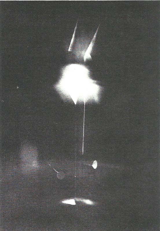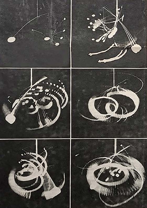 Los móviles que realiza Ferrant tienen mucho de Calder. En ellos hay una concepción espacial y cósmica. Las constelaciones del americano son prácticamente coetáneas a las del español, aunque, en su caso, ya había explorado conceptos similares con anterioridad, obras que Ferrant conocía. De la capacidad de ambos artistas para el diseño de este tipo de esculturas Eugenio d’Ors escribió un artículo de prensa, poniendo su obra en relación. Sobre Calder apunta: “es más ingenieril: Difícilmente llega a la región del puro juego”8. En otro artículo de Luis Castillo9, el texto es acompañado por una serie fotográfica que capta el dinamismo de un móvil, seguramente de Calder, a modo de cronofotografía (Fig. 6). Estas imágenes presentan un paralelismo evidente con fotografías tomadas por el propio Ferrant, en las cuales una larga exposición permite registrar la trayectoria de la obra, que se percibe casi como una vibración en el espacio (Fig. 7).