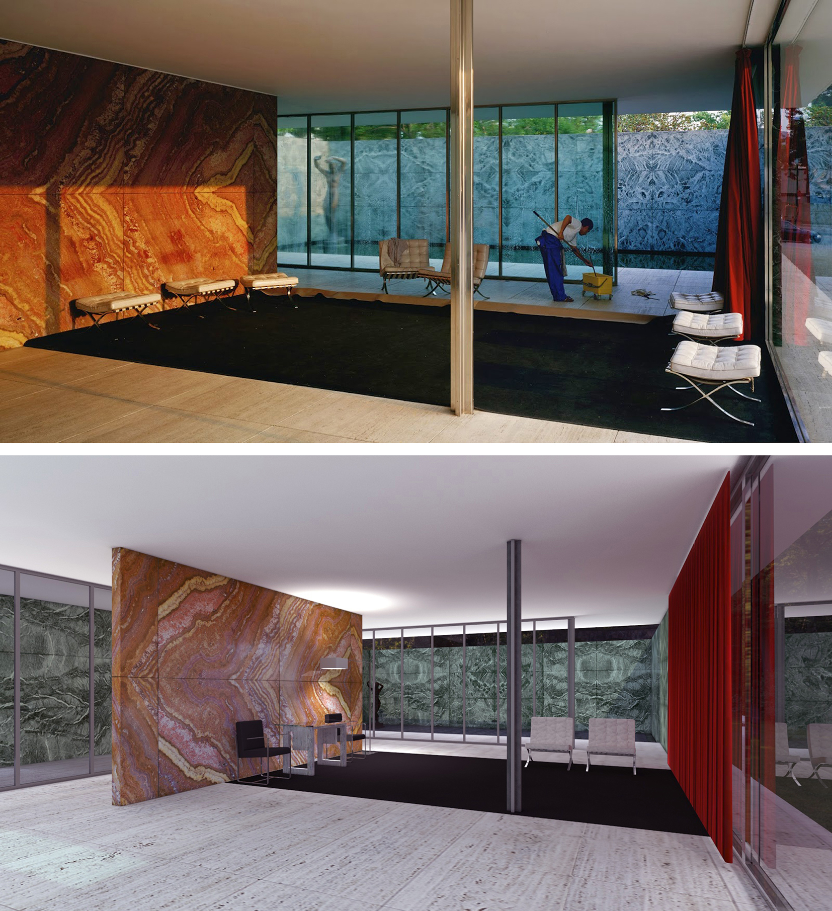 - Fig.06. Morning Cleaning. Mies van der Rohe Foundation, Barcelona (Jeff Wall) y Render informático