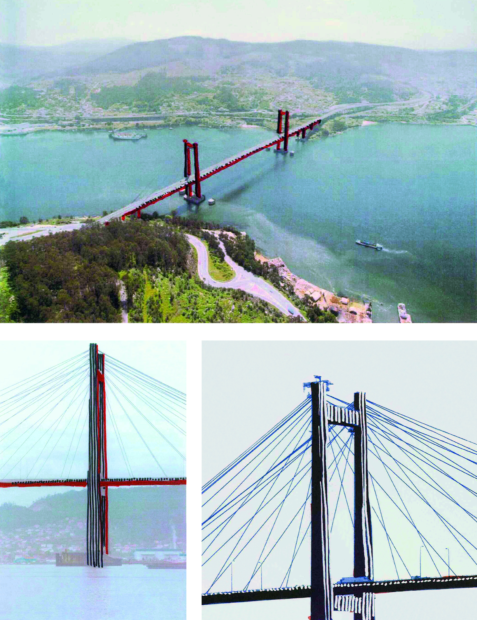 A partir de un proyecto para intervenir el Puente de Rande, en Vigo (Project pour la Galice, 2005), que nunca llegaría a realizarse, los autores, que acompañaron durante varios días al artista, investigan y estudian sus planteamientos, teniendo en cuenta su concepción metodológica. En ella están las claves de su trabajo, desde el consenso y la discusión proyectual, a su reconsideración del in situ en los espacios públicos o en el museo, haciendo uso de su reconocido útil visual más identitario –las bandas de color– y la afirmación de una obra como “transformación de lugar de acogida”, teniendo en cuenta la arquitectura, el diseño y el dibujo, la luz y el color, el contexto como naturaleza del lugar y un sentimiento de perdurabilidad que exalta la imagen esencial de lo efímero, transcrita, de manera habitual, en sus photos-souvenirs y en la posibilidad de una pintura de campo amplio.