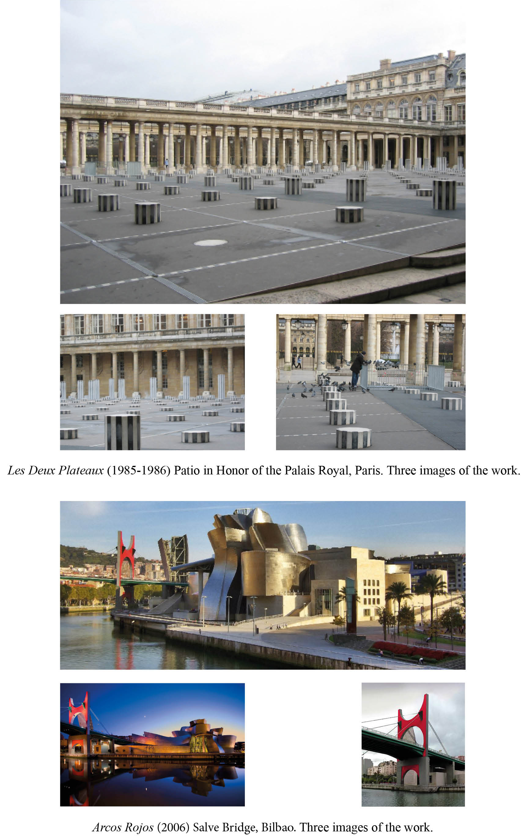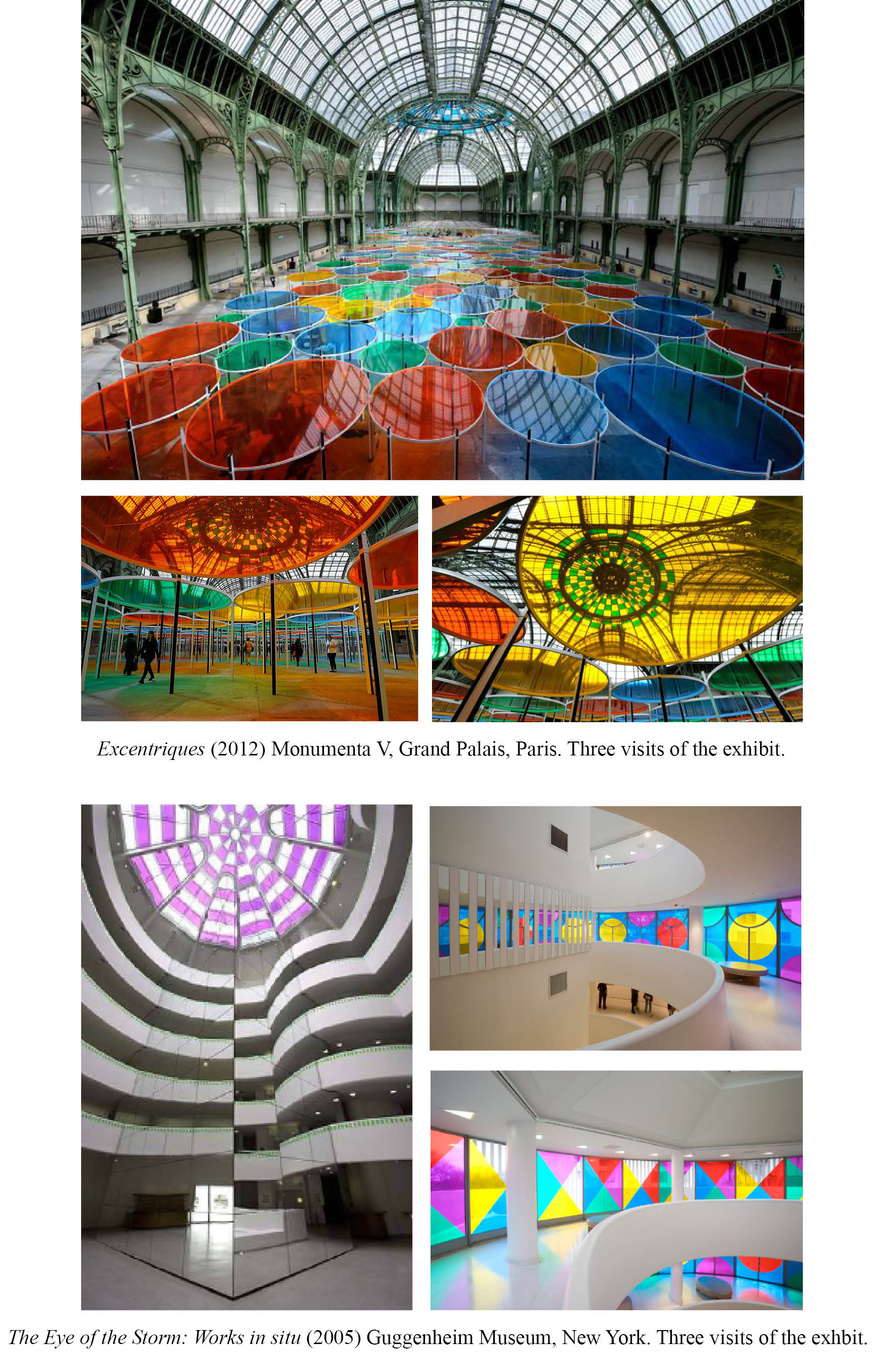 Beginning with a project to intervene in Puente de Rande in Vigo (Project pour la Galice, 2005) that would never come to fruition, its authors, who accompanied the artist for several days, researched and studied his approach while taking into account his methodical conception. In this methodology are the keys to his work: from a consensual point of view and a projectual discussion to his reconsideration of the use of public spaces and/or museums, making use of his well-known visual resource —the bands of color— and the affirmation of a piece as a "transformation of a place of welcome", while also taking into account the architecture, design and drawing, light and color, the context as nature of the place, and a feeling of endurance that exalts the essential image of the ephemeral, transcribed, as usual, in its photo-souvenirs and in the possibility of expanded painting.