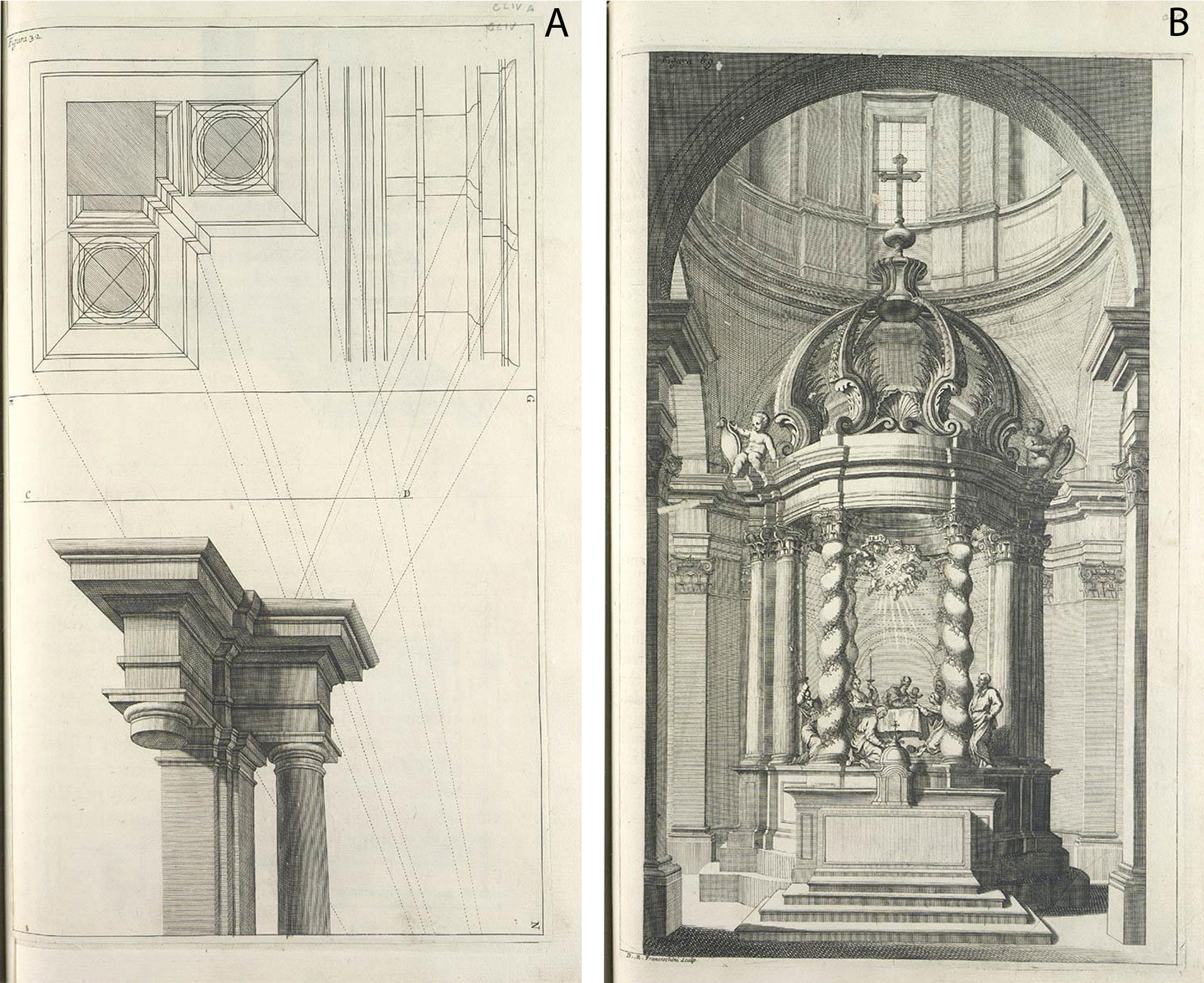 - Figura 3A. Cornisa toscana. Fuente: Pozzo Tomo II fig. 32i. Figura 3B. Altar pintado en Frascati.