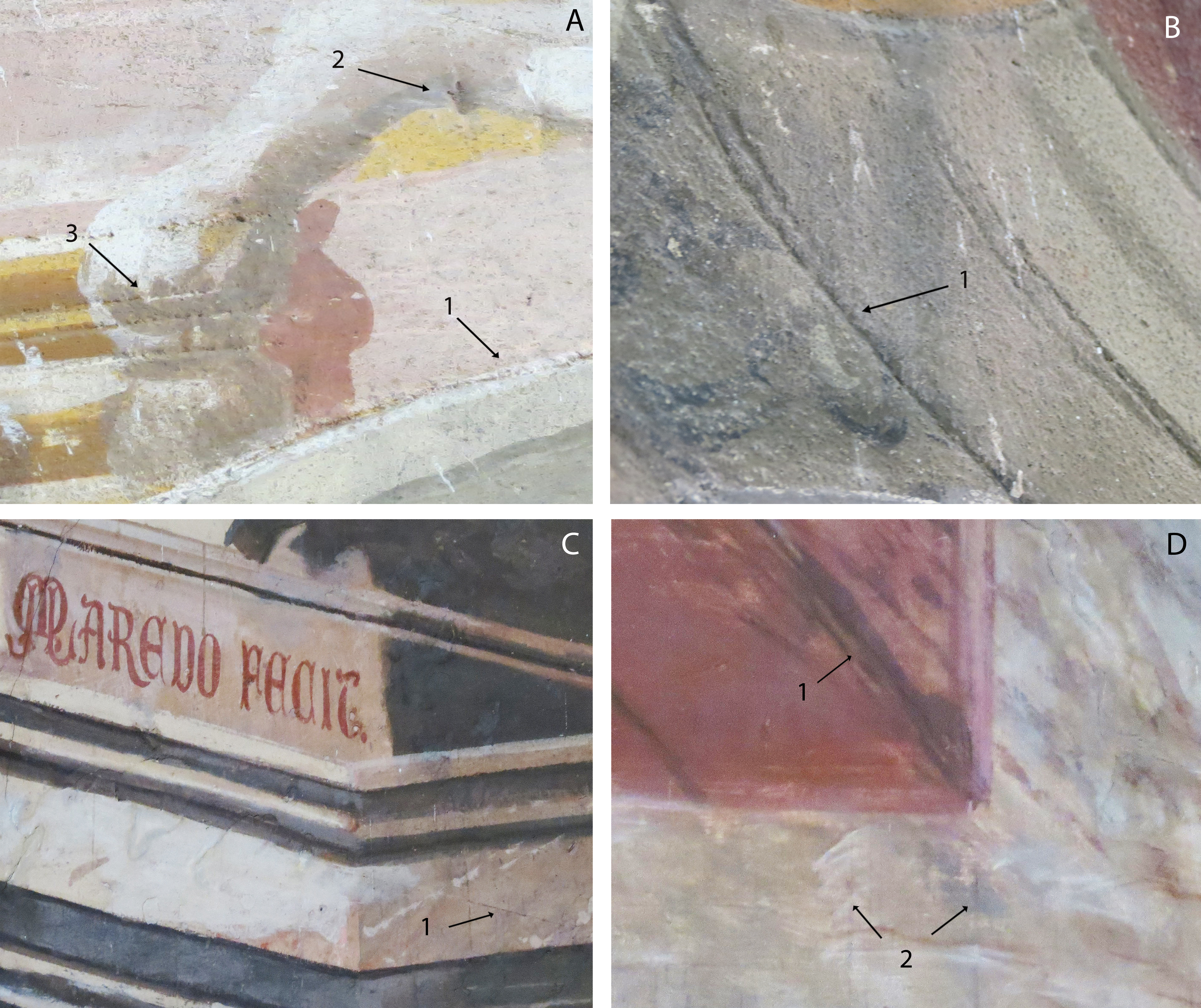 - Figura 6.A. Ermita de Nuestra Señora de la Soledad: detalle de jornada (1), agujero de cartón (2) y dibujo inciso por medio de punzón sobre mortero fresco (3). Figura 6.B. Ermita de Nuestra Señora de la Soledad: detalle del dibujo inciso (1). Figura 6.C.