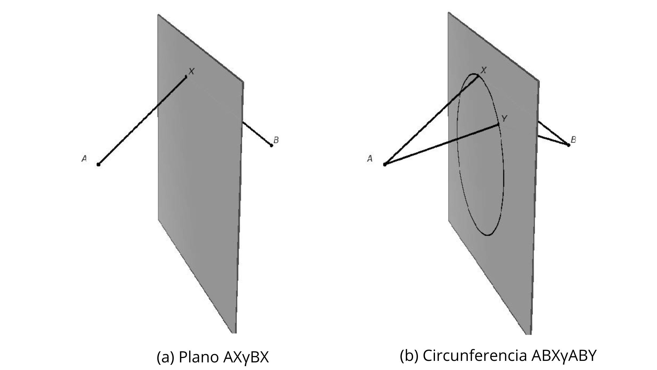 Esta definición se puede formular así: AXγBX. La figura 3 (a) ilustra la construcción: dados A y B fijos, los puntos X se encuentran en lo que nosotros llamaríamos el plano mediatriz entre A y B. ABXγABY define una circunferencia (ver figura 3 (b)).33 Es fácil advertir que AYγBYγCY define una línea recta: se trata de los puntos Y que están tanto en el plano AYγBY como en el plano BYγCY. La línea recta se concibe entonces como la intersección de dos planos. Por último, el situs de un punto individualizado –Y– se puede caracterizar así: AYγBYγCYγDY, es decir, la intersección entre las rectas AYγBYγCY y BYγCYγDY.34