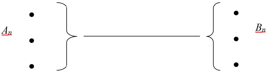 De manera similar, la forma de un estado-de-cosas es la posibilidad del modo y manera como los objetos se articulan (TLP, 2.033, 2.032). Si representamos un estado-de-cosas por un segmento de recta con sus extremos como lugares abiertos, dispuestos a acoger múltiples puntos, podemos hacernos una idea similar a la que se expone en la Figura 5. Los puntos An y Bn representan cualesquiera objetos que podrían ocupar los lugares de la articulación. Así, el esquema hace alusión a la multiplicidad de objetos (puntos) que podrían usarse para caracterizar el estado-de-cosas (recta). La presentación de TLP como geometría de incidencia no puede llevarse más lejos porque un estado-de-cosas puede llegar a necesitar más de dos elementos (objetos) para su caracterización completa y porque dos objetos pueden articularse en una multiplicidad de relaciones.