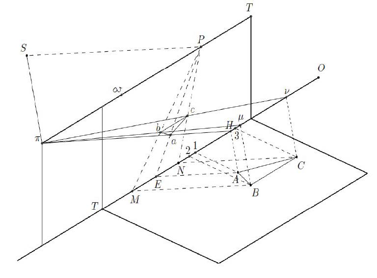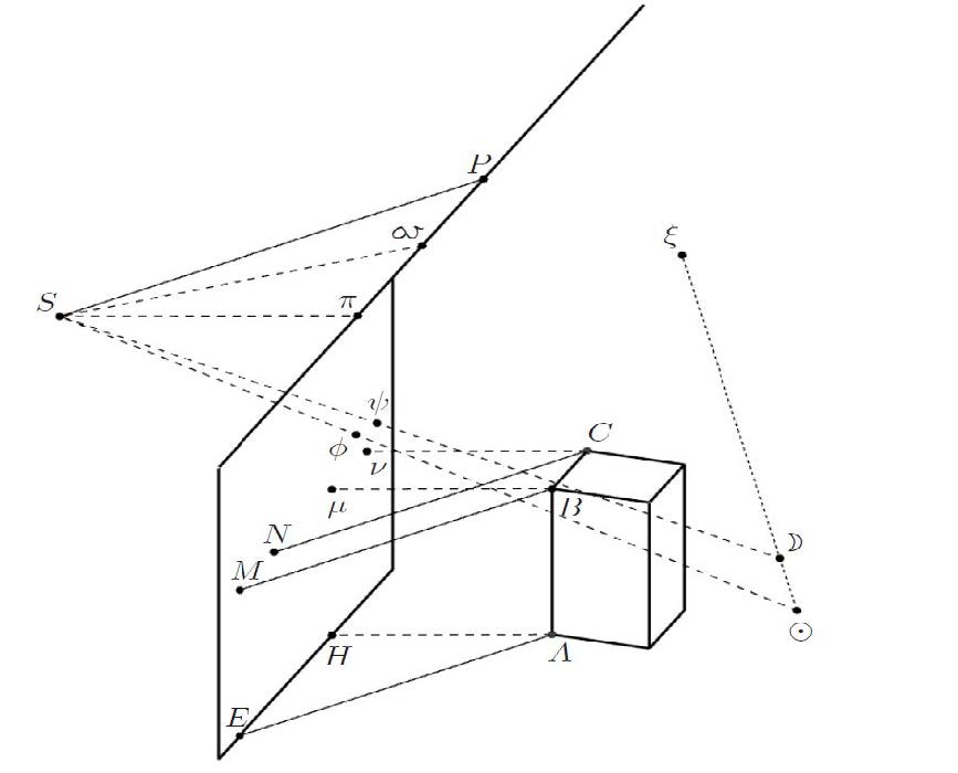 La cuestión reaparece en este punto de manera general: se trazan, a partir de unos puntos cualesquiera como A, B y C, dos conjuntos de rectas paralelas: AE, BM, CN y AH, Bµ, Cν; los puntos donde esas rectas inciden en el plano son, por lo general, semejantes a P y a π. Así, si S es el ojo, SP es la paralela anterior y Sπ, la posterior; los puntos buscados se encuentran donde se cortan las rectas trazadas, por un lado, desde E, M, N hasta P y, por el otro lado, desde H, µ y ν hasta π.