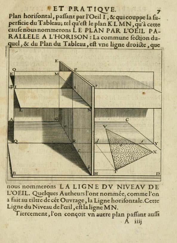 Los títulos de las obras de G. Desargues, Exemple de l’une des manieres universelles du S.G.D.L. touchant la pratique de la perspective sans employer aucun tiers point de distance ny d’autre nature, qui soit hors du champ de l’uvrage, y de E. Migon, La perspective speculative, et pratique : ou sont demonstrez les fondemens de cet art, & de tout ce qui en a esté enseigné jusqu’à present : ensemble la maniere vniuerselle de la pratiquer, non seulement sans plan geometral, & sans tiers poinct, dedans ni dehors le champ du tableau : mais encores par le moyen de la ligne, communément appellée horisontale, permiten identifcar ese tercer punto (puntum tertium o tiers point). El tercer punto es el punto de distancia, que los métodos de Desargues (sans employer aucun tiers point de distance) y Aleaume-Migon (non seulement sans plan geometral, & sans tiers poinct) rechazan,pero del que Leibniz hace constantemente uso.↩︎