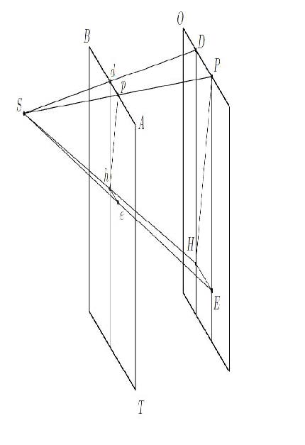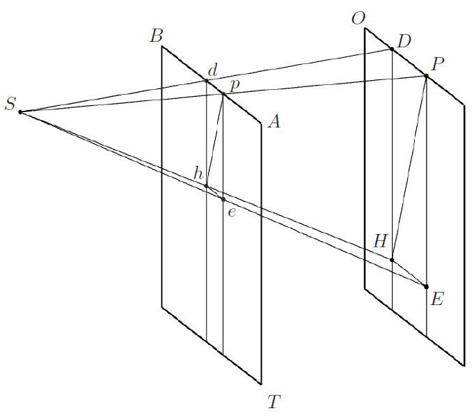S es el espectador o el ojo; TAB es la Tabula plana; O es el objeto en el que es dado un punto cualquiera, H, cuya apariencia en la Tabula, h, es buscada; h se encuentra donde la recta SH corta la Tabula. Se traza un Radio, como SP, cuyo eje óptico es el ojo, que se dirige a la Tabula y que se asume en tanto el principal; tanto todos los puntos del objeto como todos los de la representación en la Tabula harán referencia a él; el Radio, SP, corta la Tabula en p, el punto principal.20 La Tabula debe entenderse de manera continua y, de esa misma forma, debe entenderse el objeto puesto que, hasta aquí, se ha considerado todo el Espacio de manera continua (aunque solo hemos querido esbozar una parte). De modo que incida o no en la parte que queremos representar, el plano imaginario paralelo a la Tabula, en el que se encuentra el punto objetivo H, corta el radio principal en P. A ese plano imaginario le llamaremos objetivo y al punto, P, en él, principal objetivo. Puede trazarse cualquier número de rectas paralelas en cada uno de los planos al igual que se ha realizado [en la Figura 1]: en un plano, pe y hd, y, en el otro, PE y HD. Puede trazarse, de nuevo, cualquier otro número de paralelas que, en relación con las anteriores, dé lugar a otros ángulos cualesquiera; de esa manera, [en la Figura 1], se han realizado en un plano, pd y eh, y en el otro, PD y EH. A pd y eh se les llama la declinación del punto h; las magnitudes de esas rectas expresan cuánto se desvía h hacia el lado respecto del punto principal, p (ya sea ese lado el derecho o el izquierdo). A pe y dh se les llama la inclinación o la elevación del punto h; las magnitudes de esas rectas expresan cuánto el punto h se encuentra por encima o por debajo del punto principal, p. En la cosa misma, sin embargo, no hay diferencia ni entre derecha e izquierda ni entre arriba y abajo; no obstante, esas distinciones se utilizan para favorecer la imaginación y conseguir una mayor claridad en la expresión.