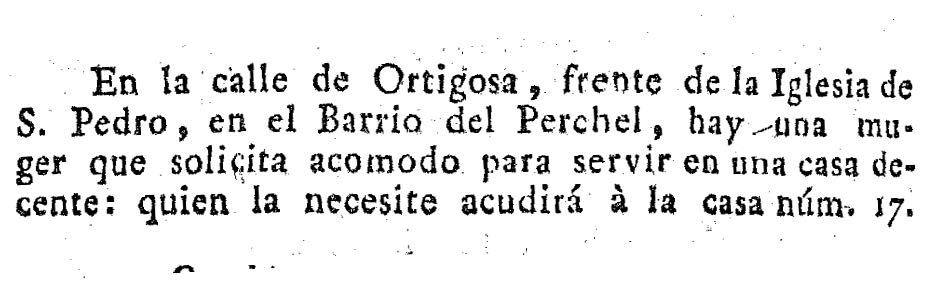 Una pobre viuda con su hija desean acomodarse juntas, para servir de criada la una y de niñera la otra. Tienen personas que las abonen, y viven calle del Rosal, núm. 5, barrio del Perchel. (El Avisador Malagueño, 01/10/1854).
