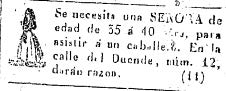 UNA señora decente desearía encontrar acomodo ya para dama de compañía, ya con un objeto análogo. Calle de Paco 7, (Compás de la Victoria). (La Ilustración Andaluza, 19/10/1879).