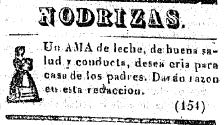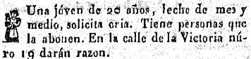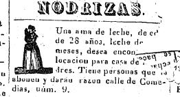 Una jóven primeriza, leche de pocos dias solicita criar en casa de los padres. No tiene cria por haberse muerto, es forastera. Darán razon en la Redaccion de este periódico. (El Avisador Malagueño, 15/05/1892).