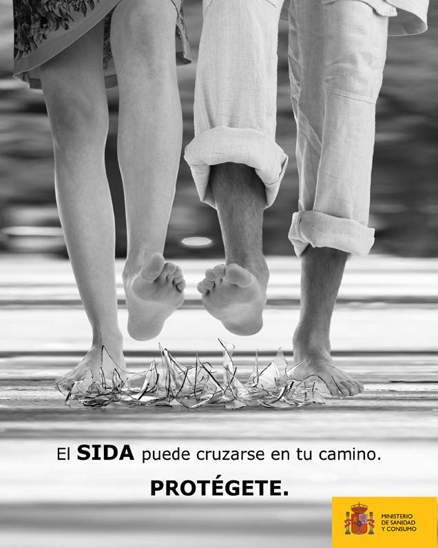Por lo que atañe a la evolución de los contenidos en los géneros promocionales, en las primeras campañas prevalecían mensajes claros y sencillos, centrados en el marco (frame) (Goffman 1974; Entman 1993) del riesgo y en la necesidad de protegerse contra una amenaza gracias a la barrera física del preservativo. Por ejemplo, en uno de los carteles utilizados en las campañas de 2000 y 2001 (Figura 1), el marco del riesgo y del dolor se construye mediante elementos verbales (“El SIDA puede cruzarse en tu camino”) y no verbales: la imagen contundente de los cristales rotos bajo los pies desnudos –es decir, sin protección–, que ocupa la parte central del cartel. Este ensamblaje multimodal orienta la percepción del destinatario hacia el peligro de enfermarse de gravedad. Obsérvese también que se emplea el término que define la enfermedad, SIDA, y no el referido al virus, VIH.