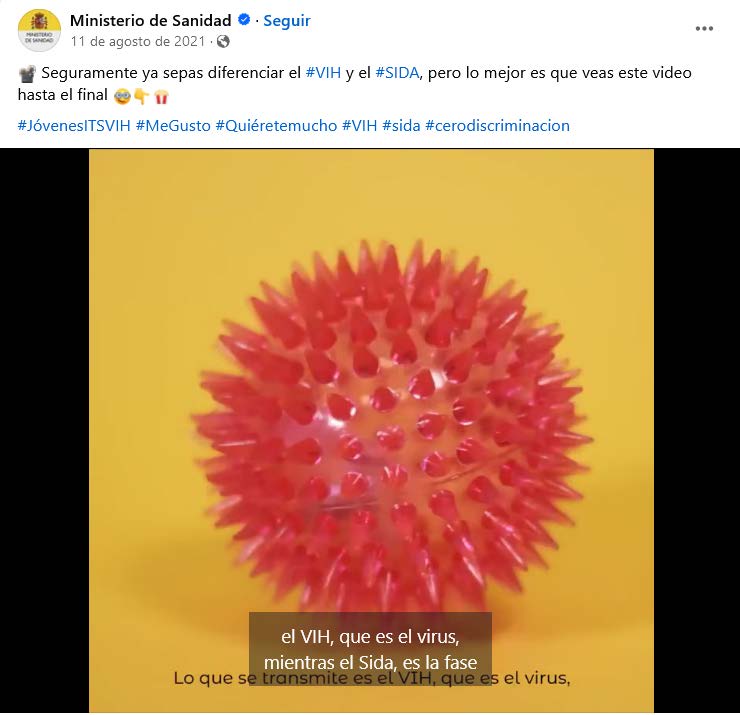 Lo que se transmite es el VIH, que es el virus, mientras el sida, es la fase avanzada de la infección por VIH. Por eso, no todas las personas que tienen VIH tienen sida, pero sítodas las personas que tienen sida tienen VIH. Gracias a la toma correcta del tratamiento antirretroviral en las personas que tienen el VIH, hace [sic] que pasados unos meses, su carga viral pueda ser indetectable, y por lo tanto no pueden transmitir el virus. Así que indetectable es igual a intransmisible. Por eso es importante que las personas con el VIH reciban el diagnóstico y comiencen el tratamiento tan pronto como sea posible. De esta manera, no solo estarán protegiendo su propia salud, sino que además evitarán que otras personas puedan infectarse. Reduce riesgos, utiliza la información. Ante la duda, hazte la prueba (Fuente: Ministerio de Sanidad en Facebook).
