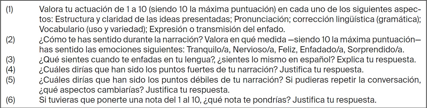 El material presentado a los hablantes de español L1 para la valoración de la capacidad de expresión emocional está constituido por dos vídeos que presentan narraciones de experiencias en las que los angloparlantes tenían que contar, en español, una situación en la que sintieron enfado durante su estancia en España. Como ya hemos avanzado, estos hablantes de español como lengua adicional, Kelly y Albert, ambos de nacionalidad británica, tienen el inglés como L1, un nivel de competencia intermedio alto en español (B2, según el Consejo de Europa, 2002) y los dos se encuentran en situación de inmersión en España por un intercambio educativo. En un curso universitario de comunicación oral en lengua española y con el objetivo de desarrollar la narración oral de eventos emocionales, se les pidió, a todo el alumnado, que narrara en español una situación de enfado que hubiera sucedido en España, ya que se ha comprobado que los hablantes expresan una emoción más intensa (Marian y Kaushanskaya, 2004), más detallada y vivaz (Javier et al. 1993) y con mayor precisión (Marian y Neisser, 2000) si recuperan un recuerdo en la misma lengua que se utilizó durante el evento. Se trataba de una tarea individual en la que cada estudiante se grabó a sí mismo narrando la situación de enfado y, además, completó un cuestionario de autoevaluación de la narración del enfado compuesto por seis preguntas (véase Figura 1) en las que los aprendientes tenían que valorar su competencia lingüística y las emociones sentidas durante la narración, así como su capacidad de expresión emocional en español. El cuestionario, de elaboración propia, está fundamentado en estudios previos. La primera pregunta, sobre el estado emocional durante la narración, está inspirada en el Emotional Patterns Questionnaire (De Leersnyder, Mesquita y Kim, 2011). La pregunta sobre la competencia lingüística está adaptada a partir de la rúbrica de evaluación de los exámenes DELE del Instituto Cervantes, que incluye la coherencia, la fluidez, la corrección y el alcance como las categorías objeto de evaluación (Instituto Cervantes, 2024). La pregunta contrastiva sobre el enfado en L1 y LA está inspirada en el cuestionario Bilingualism and Emotions de Dewaele y Pavlenko (2001-2003). Las tres últimas cuestiones, de índole metacognitivo, están fundamentadas en el Self-Assessment Questionnaire de De Saint Léger (2009).