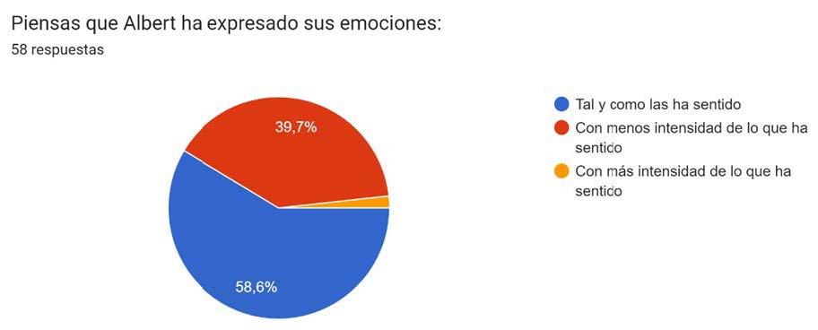 En cambio, Albert recibió una valoración relativamente alta en lo que respecta a su capacidad para expresar enfado (M=6.89; DT=1.92), aunque esta puntuación fue inferior a su autoevaluación (8). En este caso, la mayoría de los hablantes de español L1 (58.6 %) indicaron que Albert había expresado sus emociones de acuerdo con lo que sentía, como se muestra en el Gráfico 2.