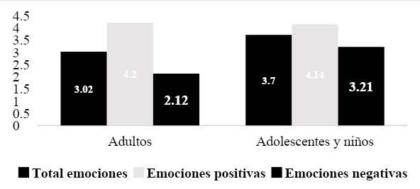 El total de las emociones experimentadas (p= .016) y las emociones negativas (p = .010) también se ven afectados por el perfil del alumnado en el grupo de profesores de ELM. Según los resultados de la prueba de Tukey la diferencia también está entre los profesores que trabajan con adultos con respecto a los que trabajan con adolescentes y niños tanto para el total de las emociones (p= .021) como para las emociones negativas (p= .032). Asimismo, los profesores de ELM que trabajan con niños y adolescentes experimentan una media de emociones negativas más alta que aquellos que trabajan con adultos, como muestra la Figura 10: