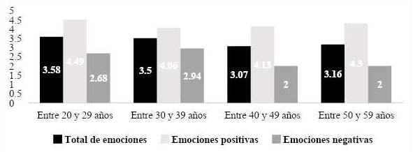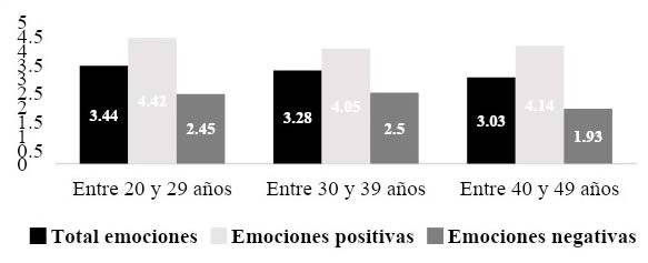 Los resultados del ANOVA revelan que la edad afecta tanto a la media total de emociones experimentadas (p= .013) como a las emociones positivas (p= .046) y negativas (p=. 007). Para poder determinar qué franjas etarias son las que afectan se lleva a cabo la prueba post hoc de Tukey, que demuestra que la diferencia reside en los profesores más jóvenes, entre 20 y 29 años, con respecto a los profesores de entre 40 y 49 años para la medida total de emociones (p= .0009) y para las emociones positivas (p= .018) y en la franja de entre 30 y 39 años con respecto a la de entre 40 y 49 años (p=.012) para las emociones negativas. En todos los casos la media es mayor para la franja etaria más joven, como muestra la Figura 3: