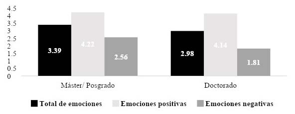 Los resultados son similares para el grupo de profesores de ELE, en el que la formación académica también afecta a las emociones experimentadas (p= .049) y a las emociones negativas (p= .011). La prueba de Tukey revela que el efecto se encuentra entre los profesores que han realizado un Máster/ Posgrado y los que han realizado un Doctorado, tanto para la media total de emociones (p= .048) como para las emociones negativas (p= .030). La Figura 6 muestra que la media de las emociones negativas experimentadas es mayor para los profesores con formación de Máster/ Posgrado que para los profesores con Doctorado: