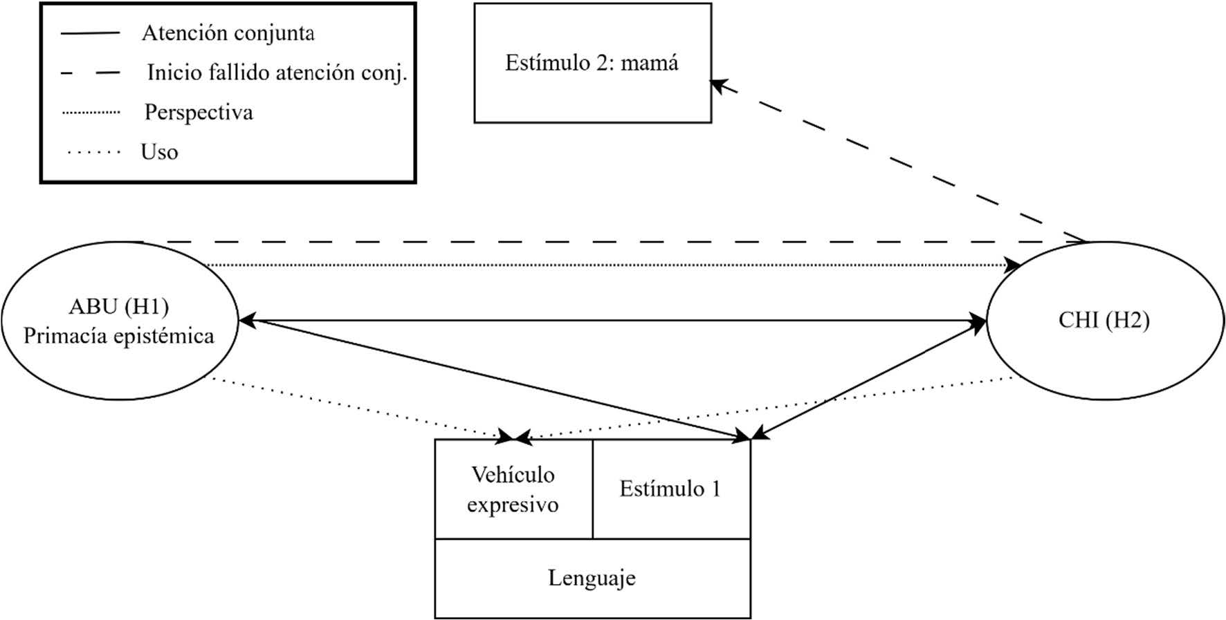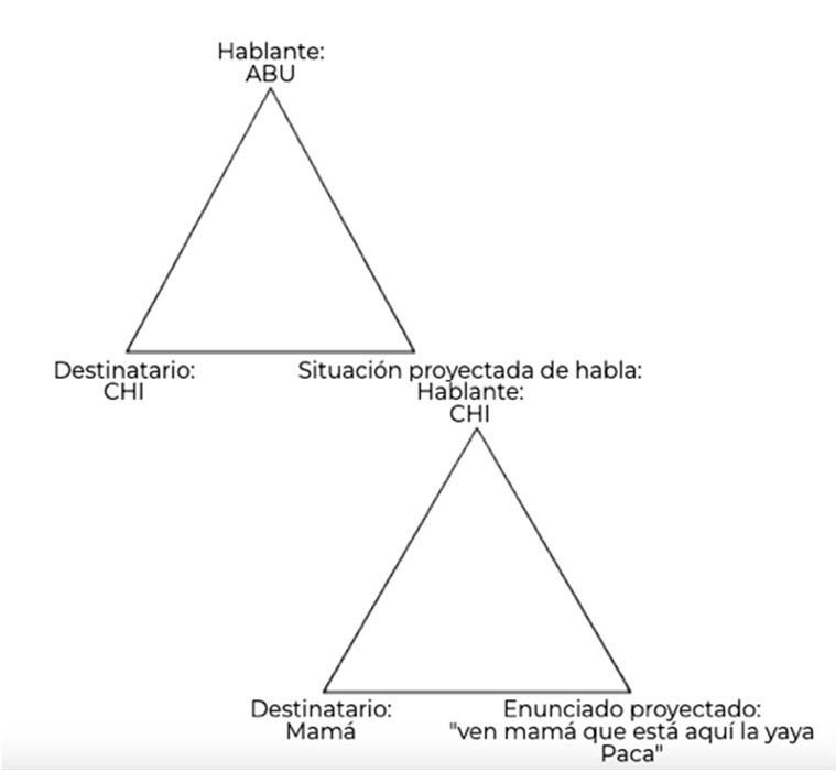 A partir de la línea 2, se inicia una situación interaccional compleja, donde ABU alinea su perspectiva con la de CHI (figura 3), pero reteniendo a la vez su primacía y autoridad epistémicas, que le sitúan como el hablante más capacitado para evaluar el referente, el lenguaje en este caso. Este alineamiento de perspectivas se produce de dos formas distintas: en primer lugar, a través de un fingimiento de perspectivas, donde la abuela asume la voz de la niña sin utilizar ningún marco introductor y, en segundo lugar, a través de una construcción específica de CDCC. Esta se halla mediada por dos marcadores explícitos: por un lado, una orden indirecta (llámala) y, por otro lado, por la presencia de un verbo comunicativo como decir en imperativo, que actúa como un transpositor de perspectivas e introduce la secuencia que debe ser repetida. La doble triangulación de perspectivas lingüísticas que se muestra en la figura 3 es paralela a la doble situación atencional generada.