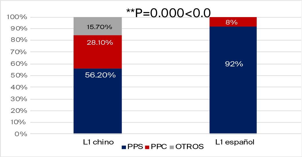 Los datos demuestran que, un 56.2% de los logros flexionados en el grupo experimental muestra PPS, un 28.1% PPC, y el 15.8% muestra otras formas morfológicas; en el grupo de control el porcentaje de PPS alcanza el 92% y el PPC solo ocupa un 8%. La Prueba exacta de Fisher de SPSS (ver la Figura 6) indica que existe diferencia significativa entre el grupo experimental y el grupo de control (c=26.818, **P=.000<.001) en las ocurrencias de PPS y PPC con logros.