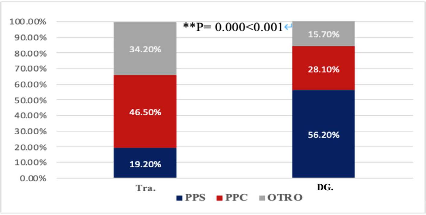 Estos resultados muestran que el porcentaje de ocurrencia de PPS con logros es reducido, solo un 19%; en cambio, el índice de ocurrencia de PPC es alto, alcanzando un 47%. El análisis de la varianza de ANOVA de SPSS (ver la Figura 4) comprueba que existe diferencia significativa en la distribución de PPS y PPC, así como otras formas, con logros en el grupo experimental (c=16.438, df=2, **P=.000<.001).