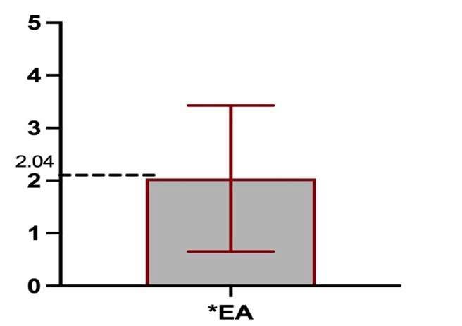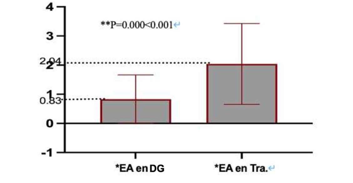 Estos datos descriptivos de SPSS indican que, de los 52 participantes chinos, 20 han producido enunciados gramaticales en los que no se da la aparición de los logros con CCAA de duración; el resto ha producido al menos un enunciado en la que se presenta la *EA. Sin embargo, si estos mismos datos los comparamos con los índices relacionados de la prueba 2 (sacados de los últimos 5 estímulos de la prueba de traducción, marcada como Tra. en la Figura 5), veremos que el número medio de la *EA ha bajado considerablemente (ver la Figura 5). El análisis de la prueba de muestras emparejadas de SPPS demuestra que existe diferencia significativa de los porcentajes de ocurrencias de la *EA en función de tareas (t=6.481, gl=51, **P=.000<.001).