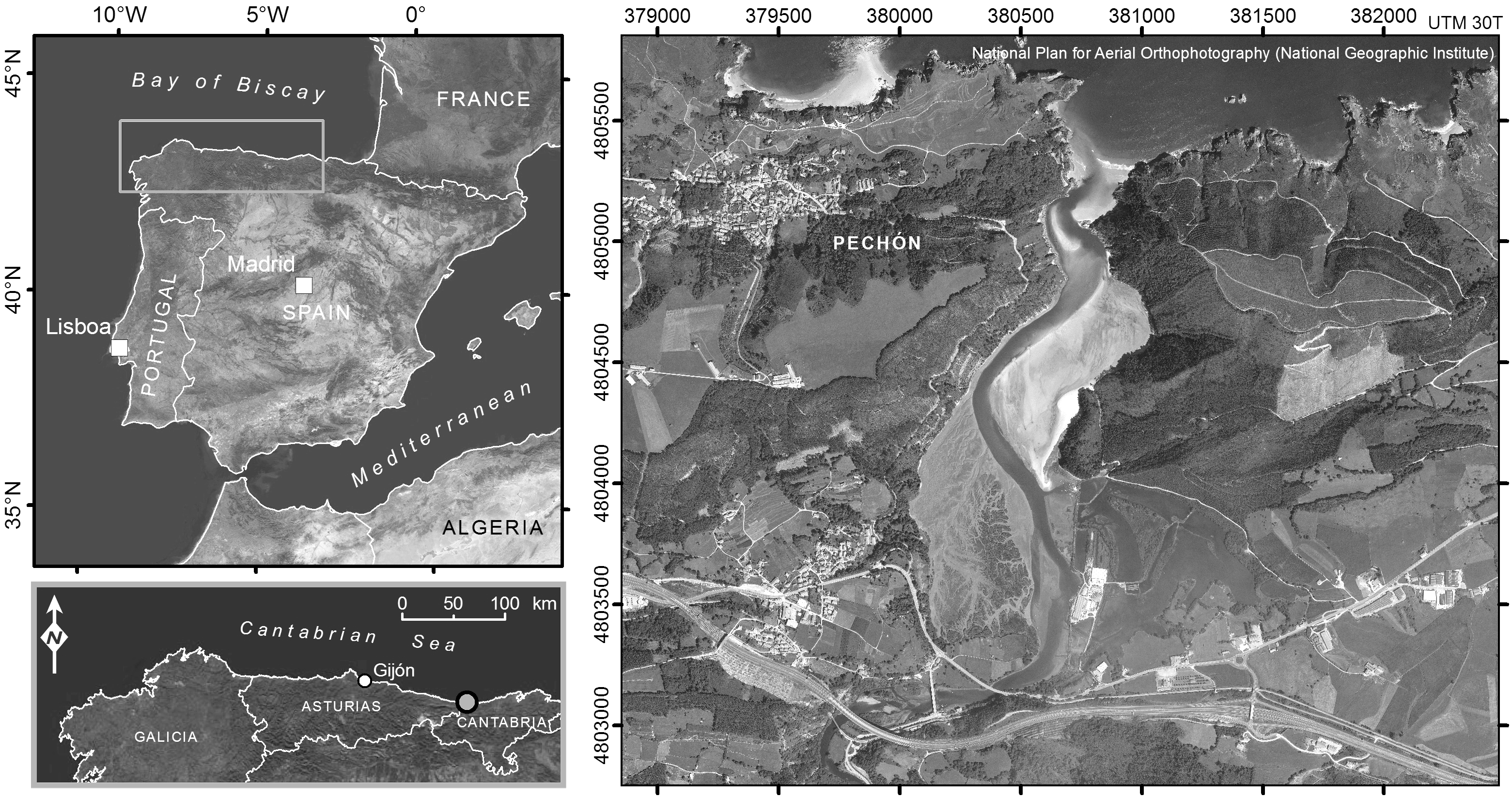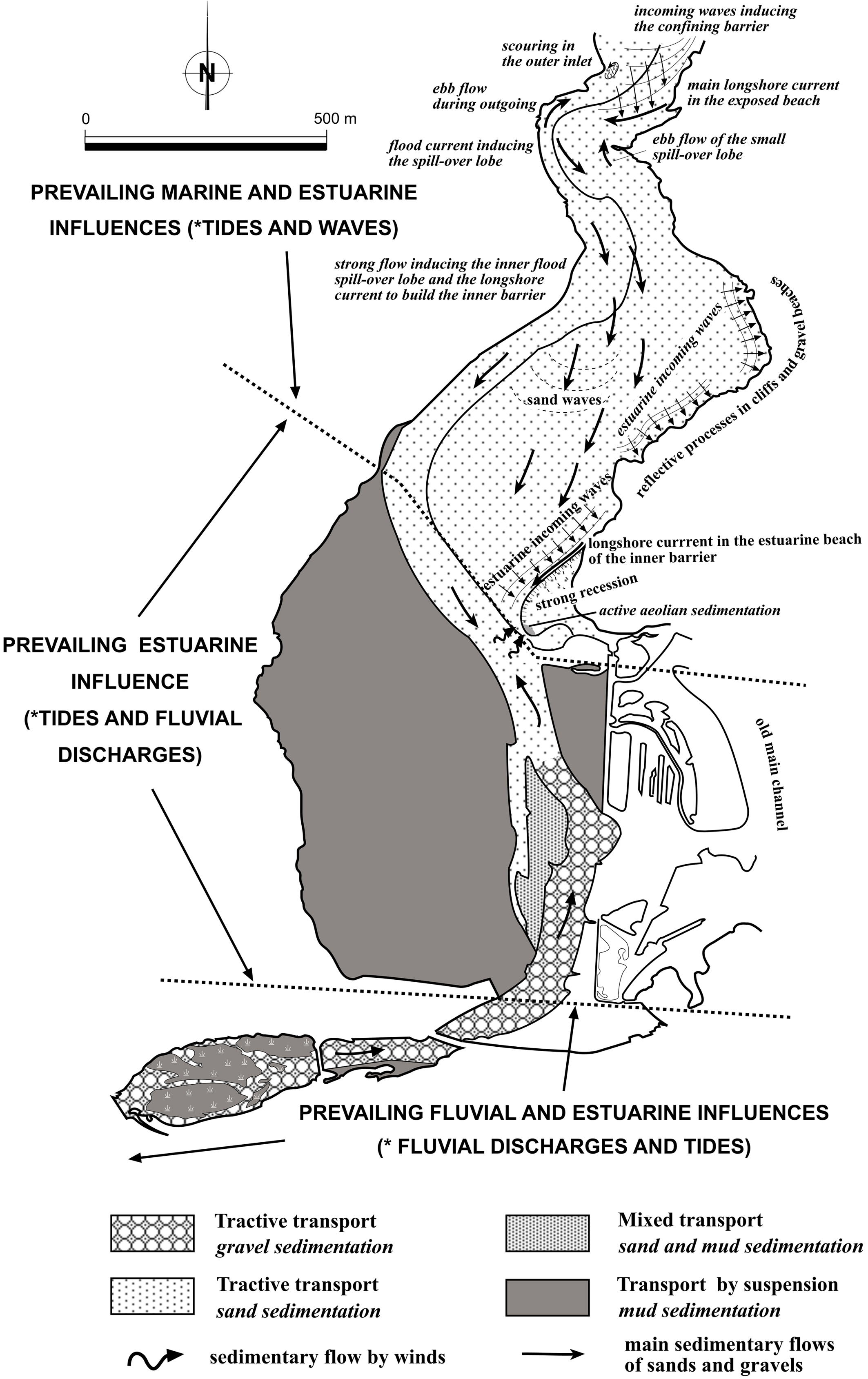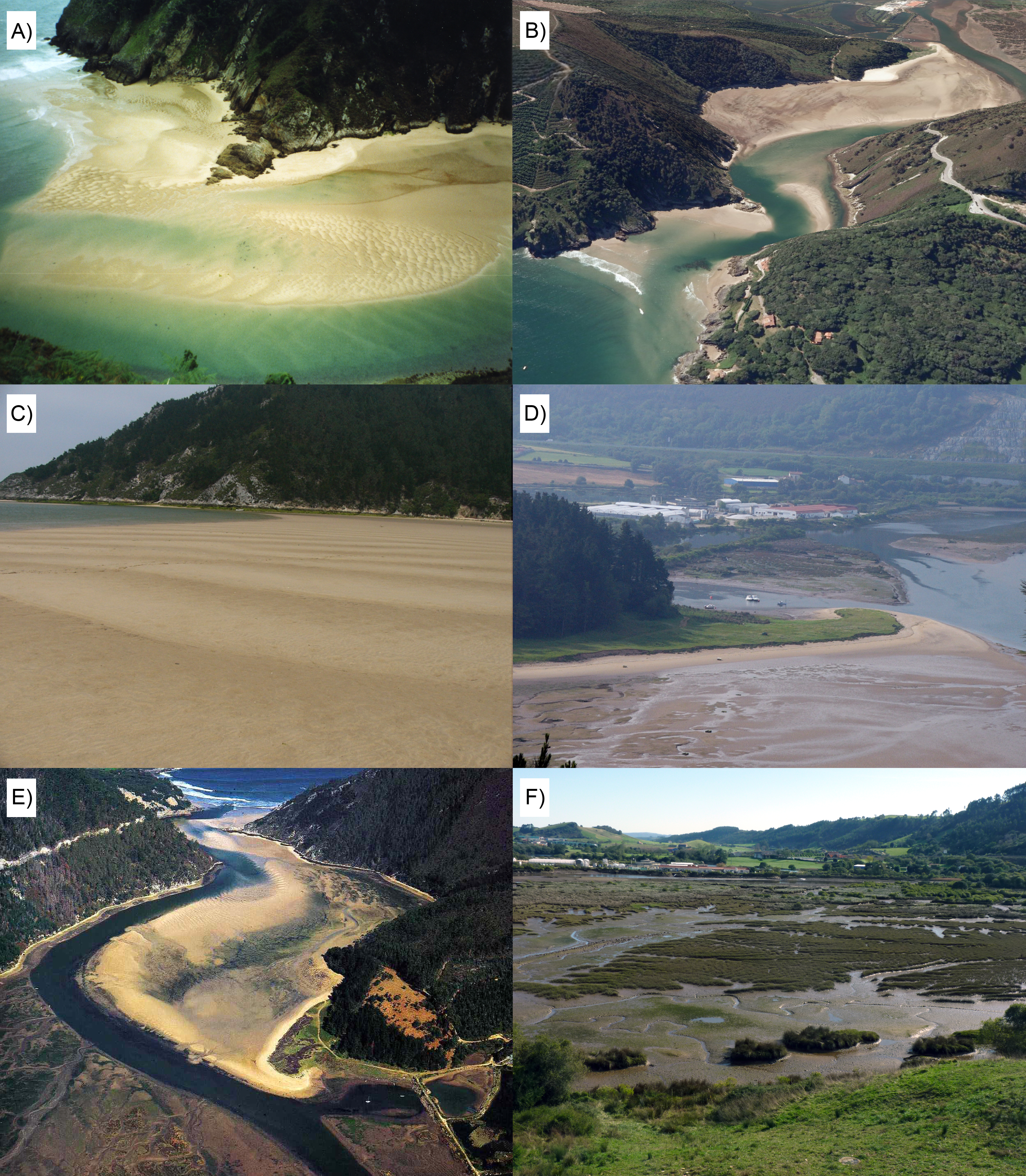 The morphology, dynamics and sedimentary distributions have been integrated to develop a conceptual model that demonstrates the circulation within the estuary. The sinuous geometry of the estuarine valley and the Coriolis Effect detected, play a fundamental role in determining the morphology and sedimentary distribution. Consequently, this study provides an adequate overview of this type of confined mesotidal estuary, quite common in the eastern Atlantic coast.