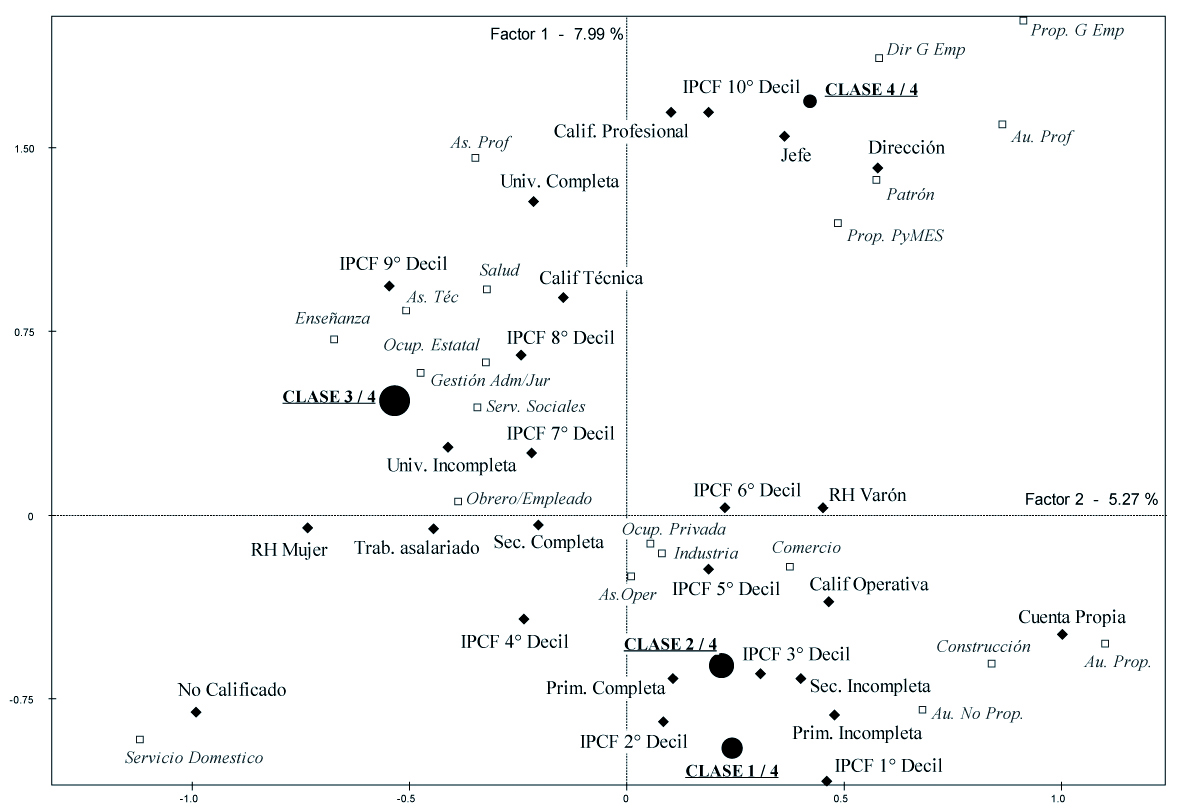 Partiendo de la noción bourdieusiana de espacio social, proponemos una construcción relacional de las clases y fracciones a partir del conjunto de recursos —fundamentalmente económicos y culturales— que disponen las familias para su reproducción. Para ello, apelamos a la utilización de métodos de estadística descriptiva multidimensional conforme a la escuela francesa de análisis de datos. Aplicamos de manera conjunta métodos factoriales y de clasificación, tomando como base la información captada por la “Encuesta Permanente de Hogares” en los terceros trimestres de los años 2003 y 2011.