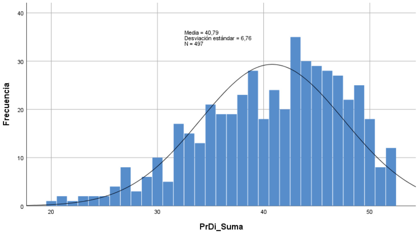 Los resultados del ítem PrDi01 (tabla 1)muestran una tendencia hacia puntuaciones altas, con una media de 3.30. La mediana y el cuartil 1 (P25) son ambos 3, mientras que el cuartil 3 (P75) es 4, evidenciando que la mayoría de los encuestados están de acuerdo o totalmente de acuerdo con este ítem. Con una desviación estándar de 0.76 y un Rango IQR de 1.00, la dispersión de los datos es moderada.