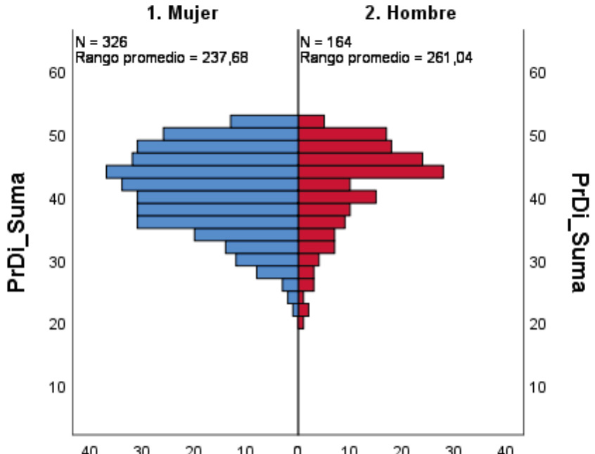 Para apoyar los resultados obtenidos a partir de los test de contraste, la Figura 2, presenta dos gráficos. A la izquierda un histograma y a la derecha se añaden los Boxplot o diagramas de cajas, ambos segmentados según el género del docente encuestado.