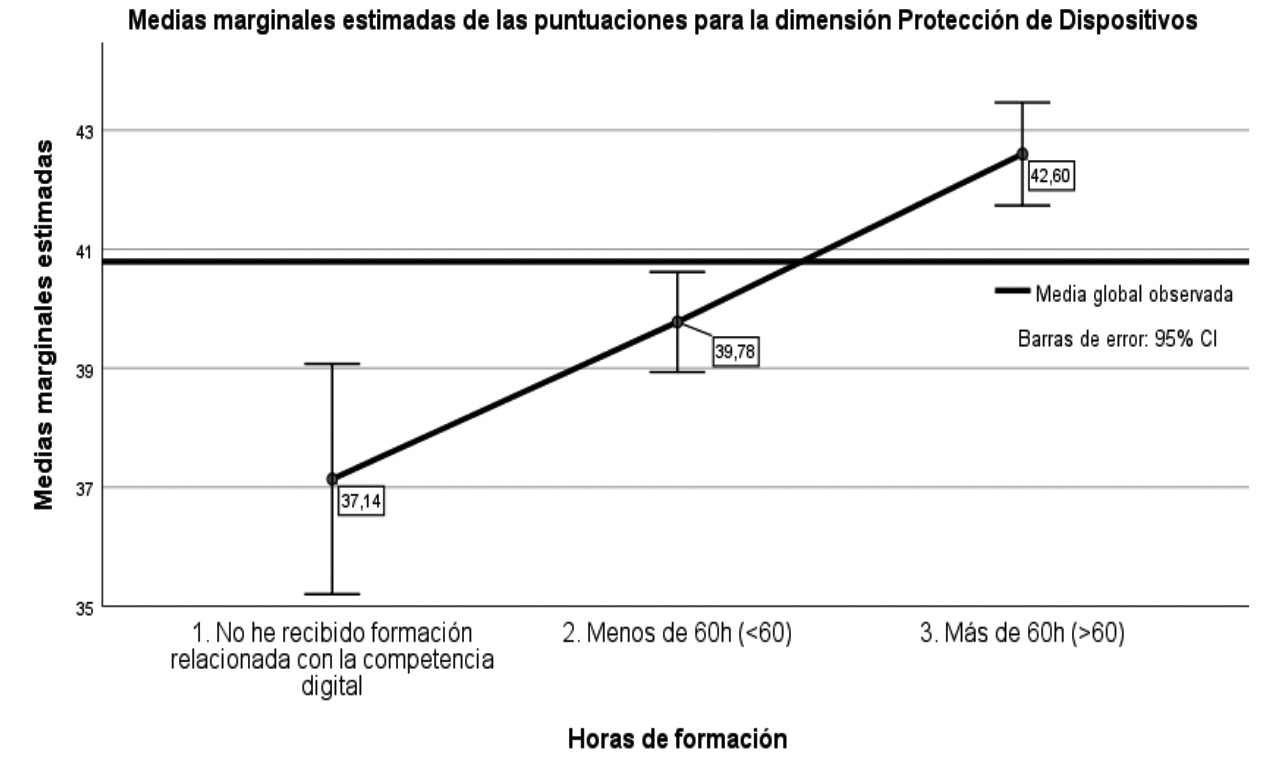 Finalmente, en cuanto a las horas de formación, los docentes con más de 60 horas mostraron puntuaciones superiores en comparación tanto con los de menos de 60, así como a aquellos que no realizan formaciones. Estas diferencias resultaron ser significativas en todos los contrastes post-hoc y en sintonía con otros estudios podemos afirmar que los futuros docentes carecen de una formación digital adecuada, respaldando la idea de una capacitación insuficiente en cuestiones de seguridad en relación a la protección de sus dispositivos y al uso de Internet (Gallego-Arrufat et al., 2019).