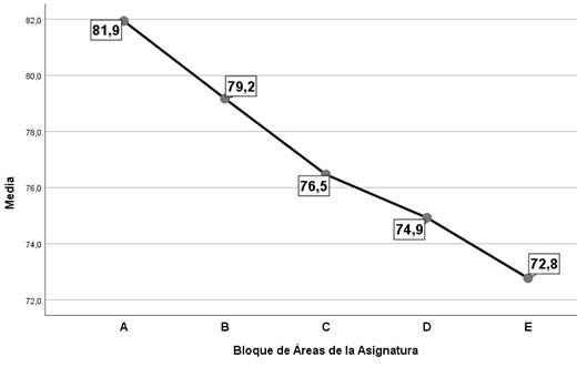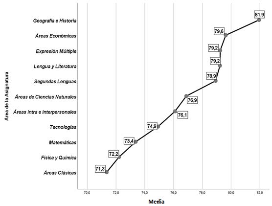 Para el contaste de las variables generadas en el cuestionario entre estas áreas se ha recurrido al método de ANOVA de un factor detecta una significación estadística (p < .05) acompañada de un tamaño del efecto ya moderado (4.6%). Revisando los valores medios comprobamos que sobresale Geografía e Historia con el valor más alto (81.9) y que según los test post-hoc de Tukey presenta significación con respecto a las dos áreas de menor puntuación: Física y Química (72.2) y Clásicas (71.3). Pese a la significatividad estadística ya encontrada, hemos optado por una observación más detenida del conjunto de valores medios (figura 5), lo que nos hace pensar en la existencia de hasta 5 bloques: un primer bloque con Geografía e Historia seguido de un segundo grupo de 4 áreas: Económicas, Expresión múltiple, Lengua y Literatura y Segundas lenguas, con valores entre 79 y 80 puntos; el tercer bloque lo conformaría dos áreas: Ciencias Naturales y la Intra e interpersonal, con valores sobre los 76 puntos; seguido del cuarto grupo que contendría solo a la Tecnología (75 puntos) y finalmente, el quinto grupo, con el mismo bloque de 3 áreas: Matemáticas, Física y Química y Clásicas, con valores entre 71 y 73 puntos.