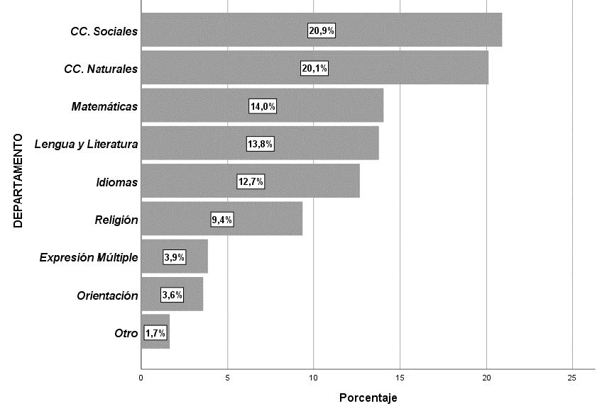 a esa respuesta múltiple, un 25.1% (70) pertenecen a 2 departamentos y el resto a 3. Considerando el total de las respuestas dadas, se ha observado que hay 2 departamentos que aparecen por encima del resto: CC. Sociales (20.9%; 76) y CC. Naturales (20.1%; 73), seguidos por un trio conformado por: Matemáticas (14.0%), Lengua y Literatura (13.8%) y tras ellos, Idiomas (12.7%). El resto está por debajo del 10% (figura 2).