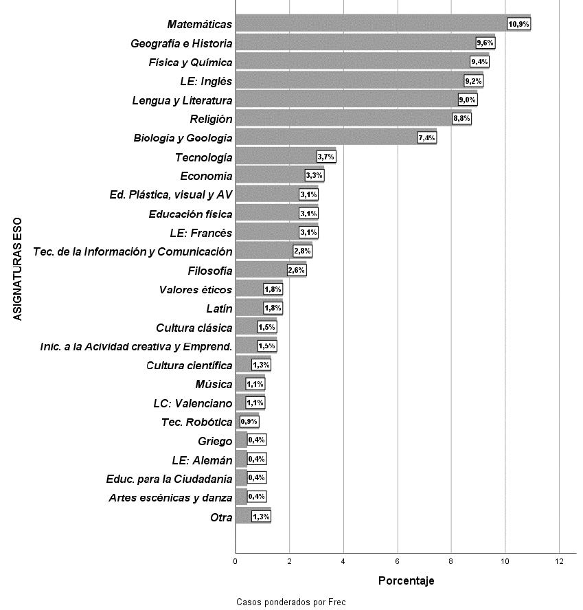 Así mismo, el número de asignaturas que imparten y aplican la metodología ABP, ítem que toma valores en el rango de entre 1 y 5, con mediana en 1 sola asignatura que fue la respuesta más frecuente (52.3%; 146), seguida de: 2 asignaturas (34.4%; 96), acumulando ya al 87.1% del total, por tanto, el restante 12.9% imparte 3, 4 o 5 materias diferentes, siendo el número medio de 1.64 asignaturas (IC al 95%: 1.54–1.73; con desviación estándar: .81); y la asignatura que imparten los mismos, aumentando el número de respuestas hasta las 457 por esta connotación de multi-respuesta, reflejadas en la figura 3. A partir de la misma, se observa que los más representados son los profesores de Matemáticas (10.9%; 50); seguidos de un grupo que está presente de forma muy similar con margen entre un 9% y 10% de respuestas: Geografía e Historia (9.6%), Física y Química (9.4%), Inglés (9.2%), Lengua y Literatura (9.0%) y cercano al 9%, como resulta con Religión (Educación Religiosa Escolar, ERE) (8.8%). Le sigue, Biología y Geología (7.4%) y el resto de las asignaturas están ya por debajo del 4%.