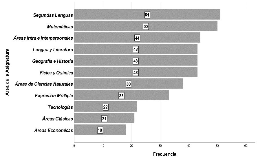 Tal y como ocurriera con la variable referida a la antigüedad como docente, en la referida a la asignatura que se imparte el variado número de asignaturas expuestas así como la falta de significatividad estadística en varias de ellas han obligado a recodificar esta variable en agrupaciones de asignaturas afines reduciendo el N de casos resultante para este análisis estadístico hasta los 406 procedentes de las respuestas dadas por los 279 participantes en la investigación, dada la multiplicidad de respuestas agrupadas. El factor resultante de la recodificación tiene 11 categorías cuyo tamaño se distribuye según se puede apreciar en la figura 4, siendo las Segundas lenguas la más representada (12.6%) seguida de las Matemáticas (12.3%) y las áreas: Económica (4.4%) y Clásica (5.2%) las que menos aparecen.