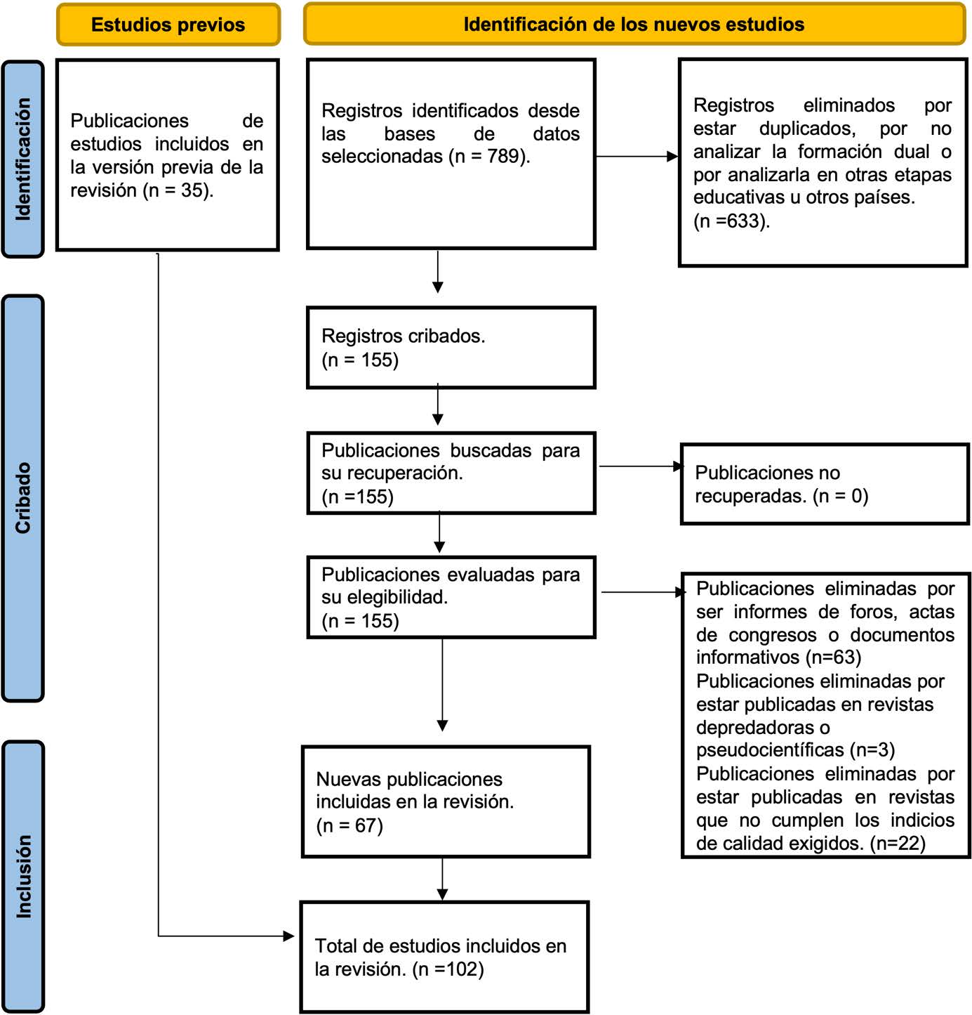 En concreto, se consideran como publicaciones previas las 35 incluidas en el diagnóstico de Echeverría Samanes y Martínez Clares (2019) dentro de la categoría FP Dual publicadas en el período 2012-2017, que abordan esta modalidad de enseñanza en España. Por otra parte, para identificar las nuevas referencias se consultaron digitalmente, durante julio de 2023, diversas bases de datos científicas reconocidas que indexan trabajos en español.