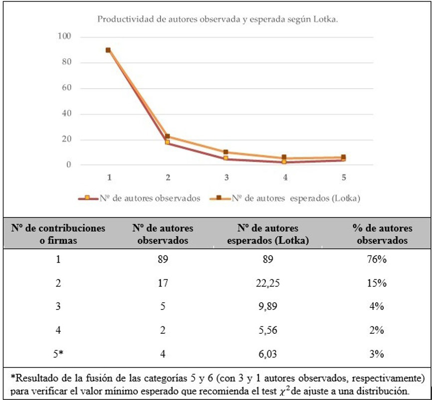 A continuación, analizamos en mayor profundidad la distribución de los autores según el número de sus contribuciones o firmas, verificando si dicha distribución cumple el patrón establecido por la Ley de Lotka (1926):