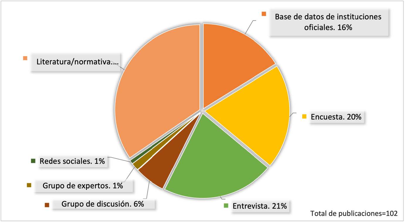 Siendo, tal y como se ha comentado, la metodología cualitativa la más utilizada, no es de extrañar que las principales fuentes de información sean la literatura y la normativa (35%) y las entrevistas (21%) (Figura 10). En cuanto a las fuentes de información cuantitativa, las encuestas ocupan el primer lugar (20%), seguidas de las bases de datos oficiales (16%).